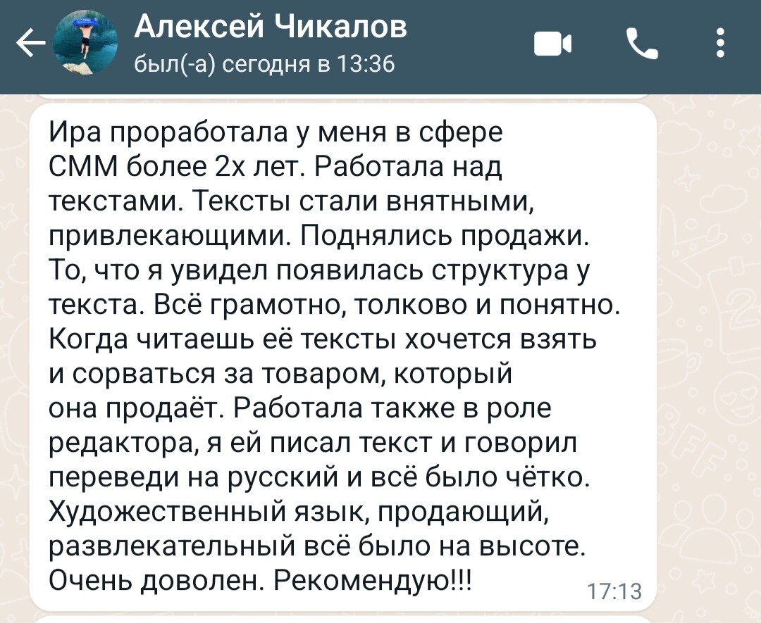 У каждого автора свой уникальный стиль написания. Ознакомиться с моим и понять, нравится ли вам моя подача, можете в портфолио. Мои тексты легко читаются и динамичны, потому что я убираю сложную терминологию. Не использую страдательные залоги и громоздкие конструкции. Люблю инфостиль, метафоры. В продажах применяю триггеры и психологические крючки. Также в стоимость всех текстов входит 1 крупная и 2 мелких правки. Обычно этого достаточно, чтобы скорректировать их до желаемого результата.